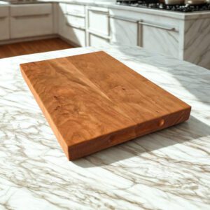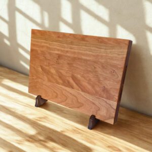 This one is cut from solid cherry. Cherry is the wood that warms up a kitchen — an amber tone out of the shop that deepens over the years with light and use. Edge grain construction keeps it kind to knives.