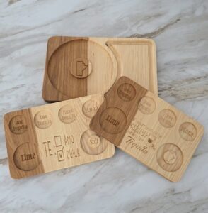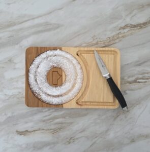 The rimmer board turns the rim step from a messy countertop moment into a handled ritual. Sized to sit beside a shaker without taking up the room.