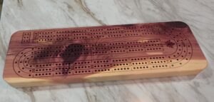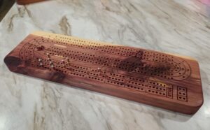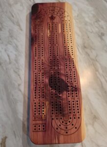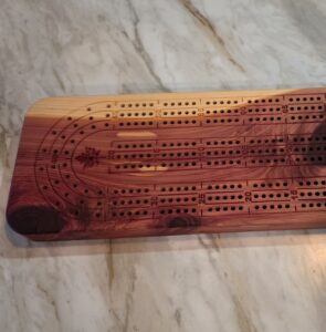 Fourteen inches long, 4.5 wide, 7/8 thick. 120-point layout routed cleanly across the flat surface. Cedar is softer than the hardwoods in the rest of the shop — it dents more easily, but it’s built for play, not prep. A cribbage board lives on a coffee table, not a cutting counter.