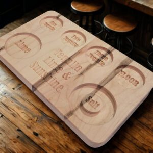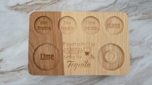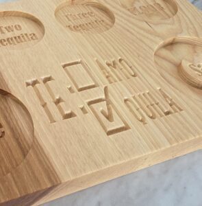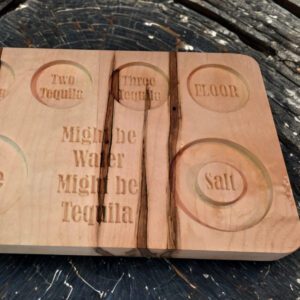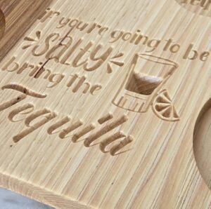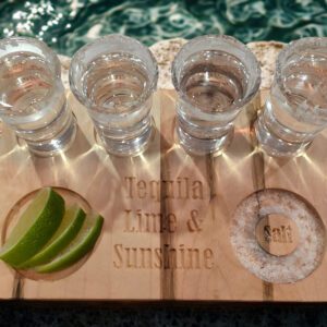 Tequila deserves a proper presentation. This flight board holds four standard shots in set wells, plus recesses for lime and salt — the full ritual in one piece of wood.