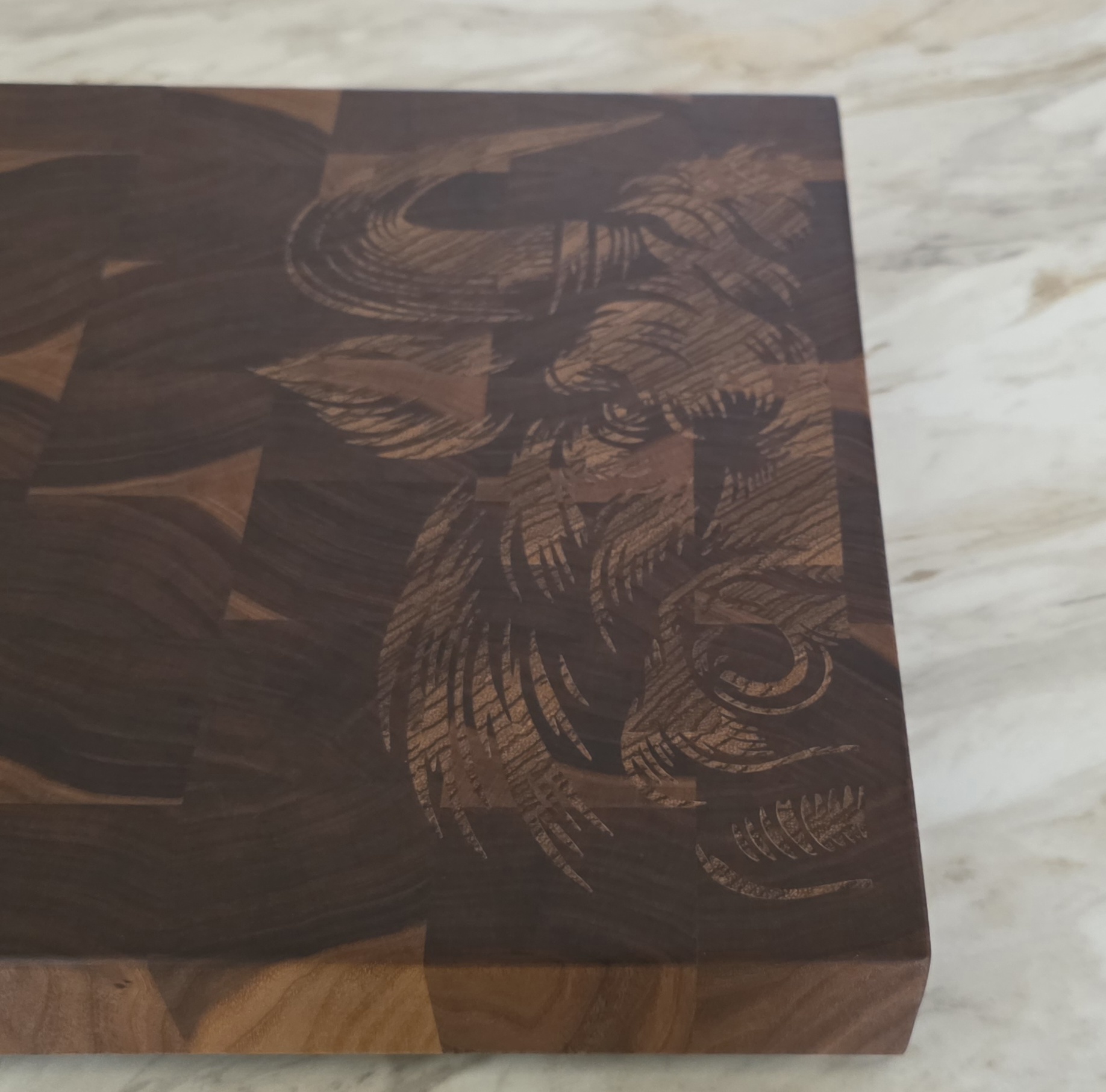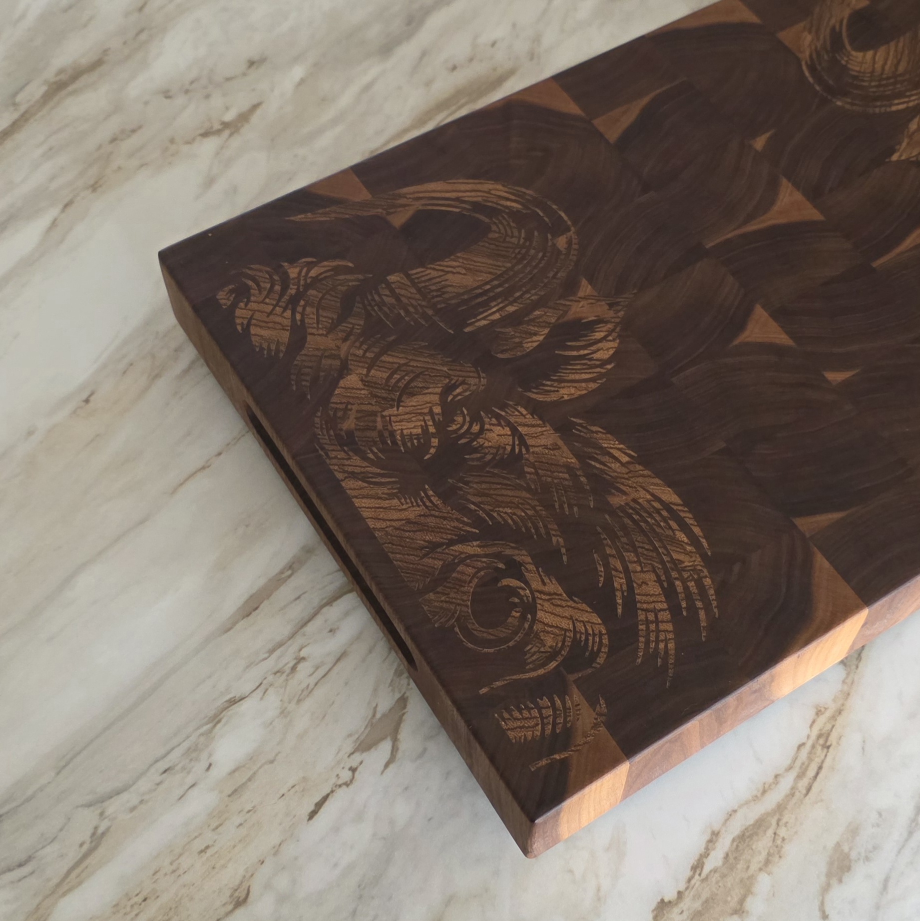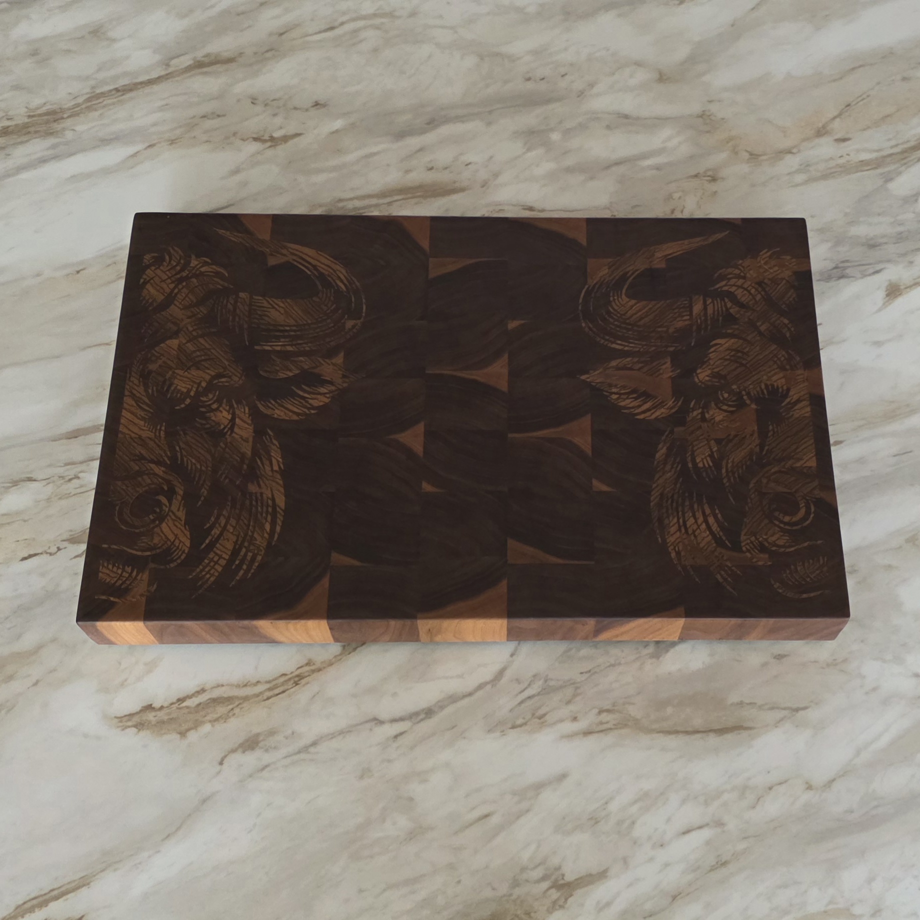 At 1.75 inches thick in walnut end grain, this is a full-weight end grain butcher block — the standard a working kitchen asks for. Butcher blocks are defined by the glue-up: thick hardwood, vertical grain, built to be used hard and resurfaced over decades. The Boreal Relief lands squarely in that definition, with a custom motif most butcher blocks never get.