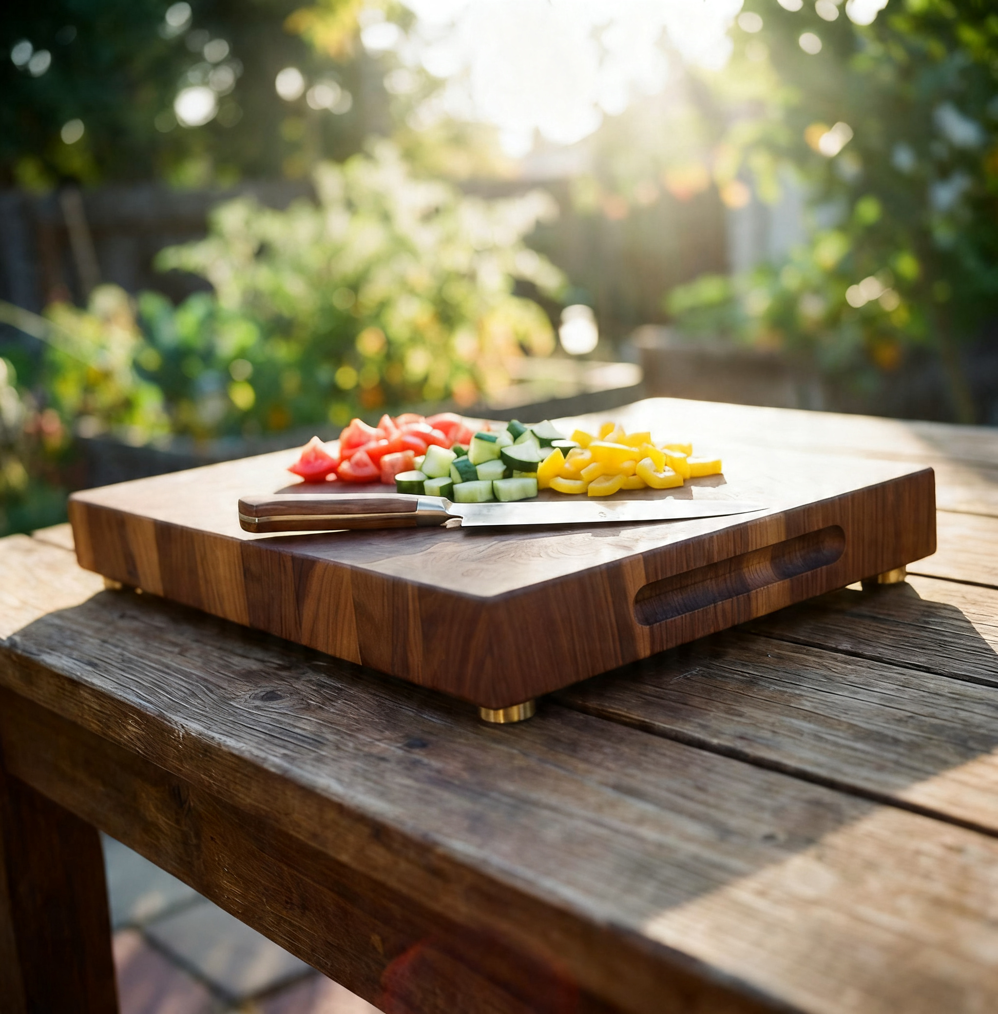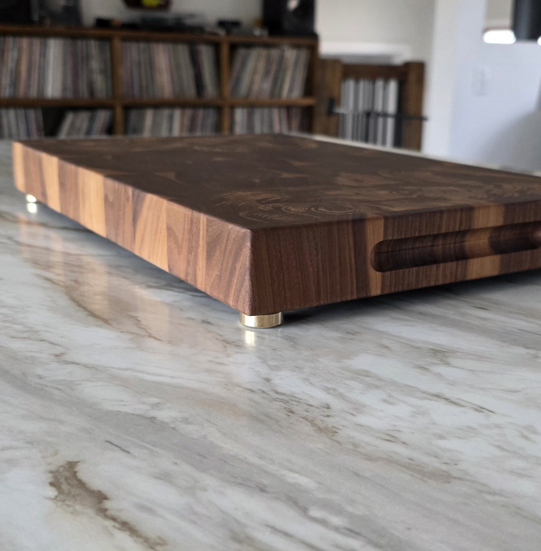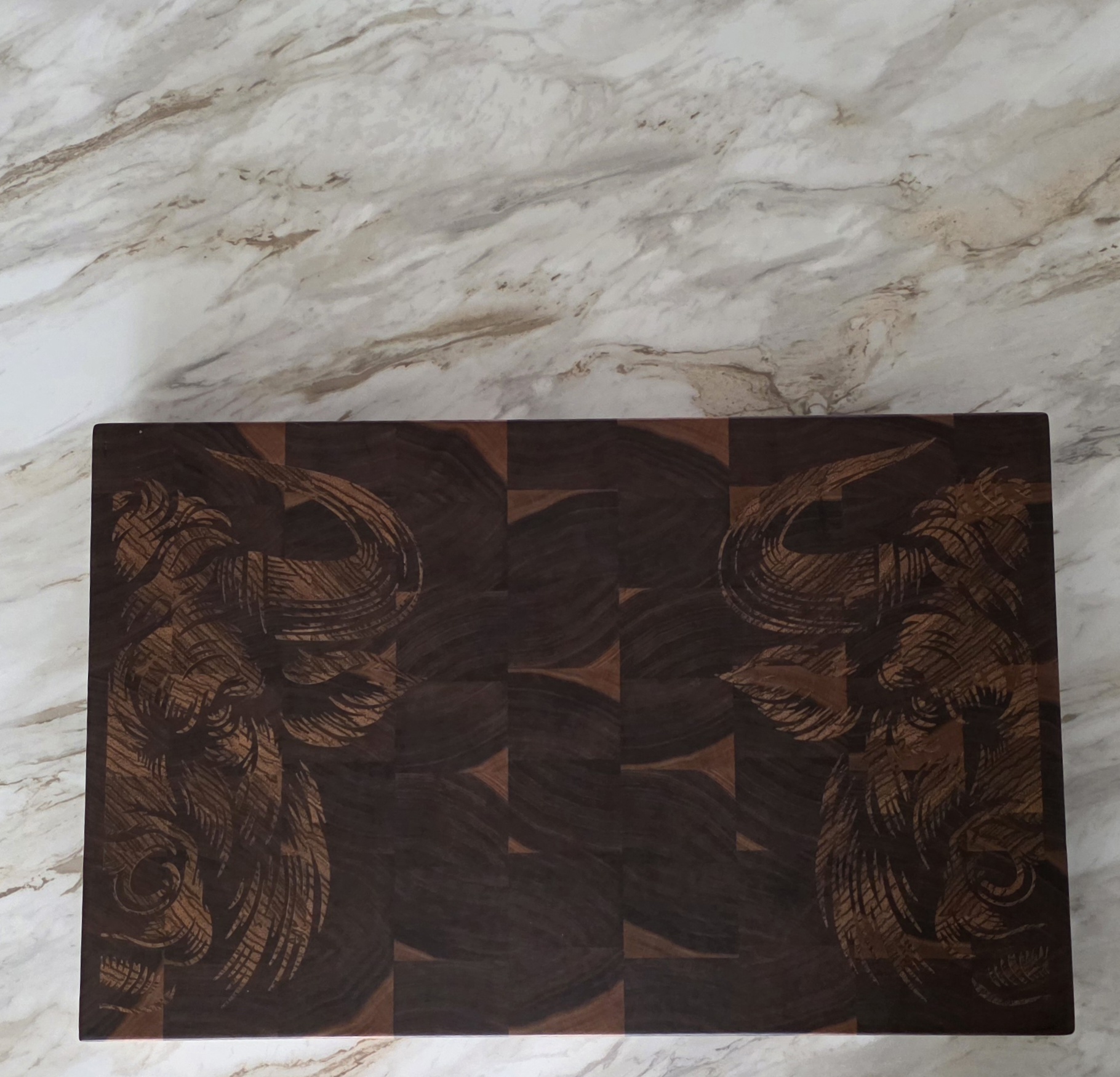 At 1.75 inches thick in walnut end grain, this is a full-weight end grain butcher block — the standard a working kitchen asks for. Butcher blocks are defined by the glue-up: thick hardwood, vertical grain, built to be used hard and resurfaced over decades. The Boreal Relief lands squarely in that definition, with a custom motif most butcher blocks never get.
